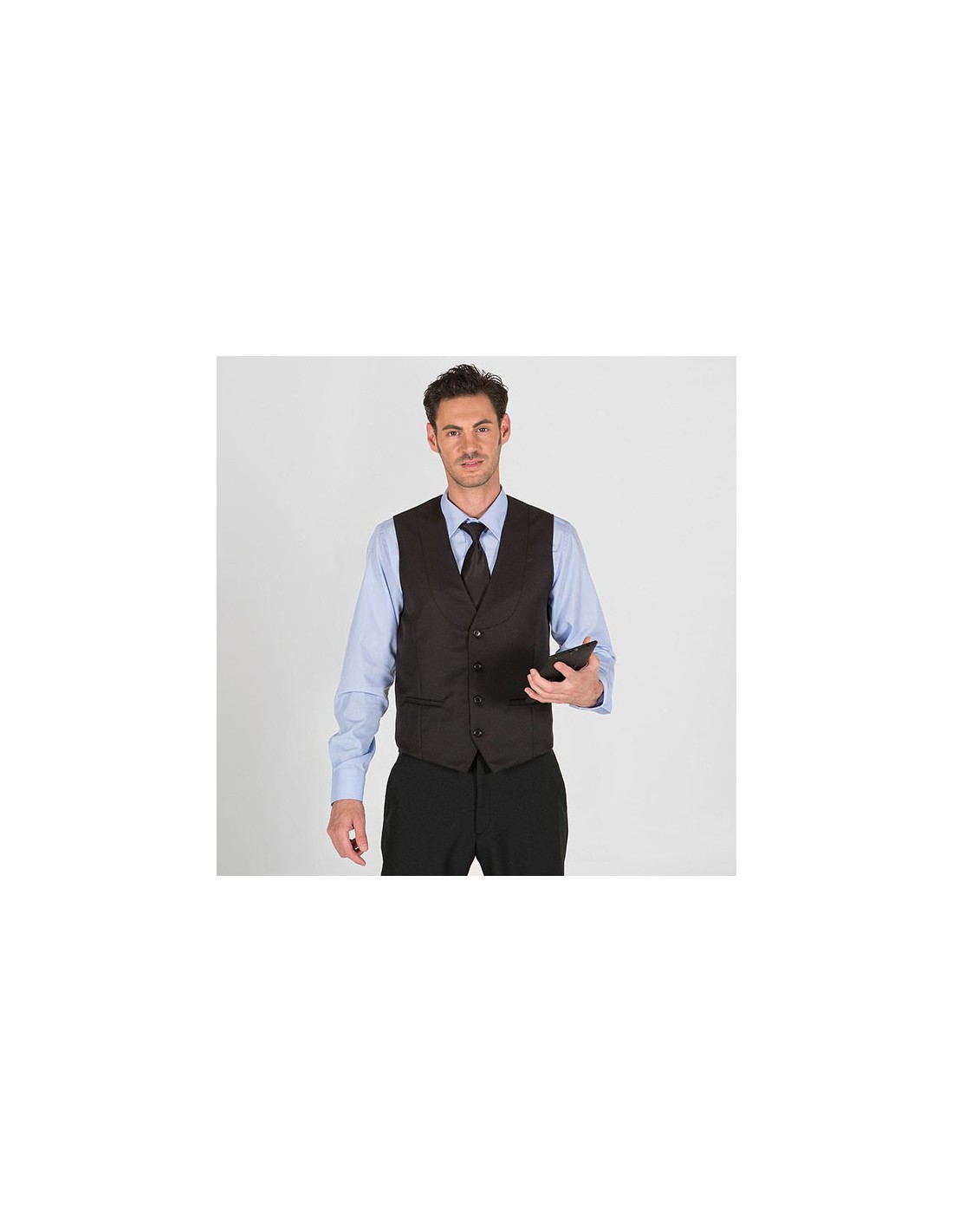 Chaleco unisex con botones de pastilla vistos, cuello smoking y dos bolsillos de vivo. Modelo semi ajustado, con pinzas en delantero. Confeccionado en SARGA de 100% Poliéster color negro. Es ideal para uniformes de camareros en hostelería y restauración.