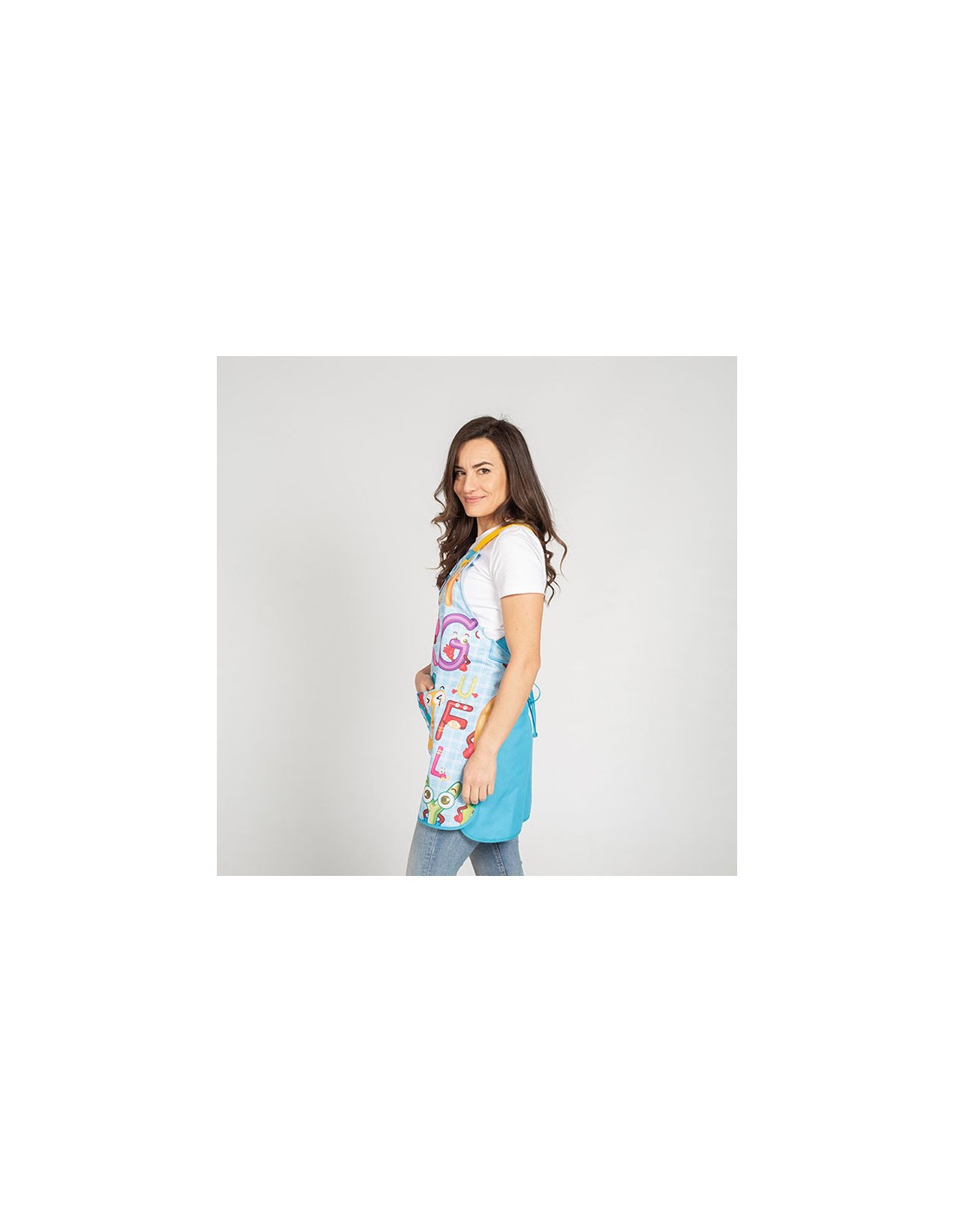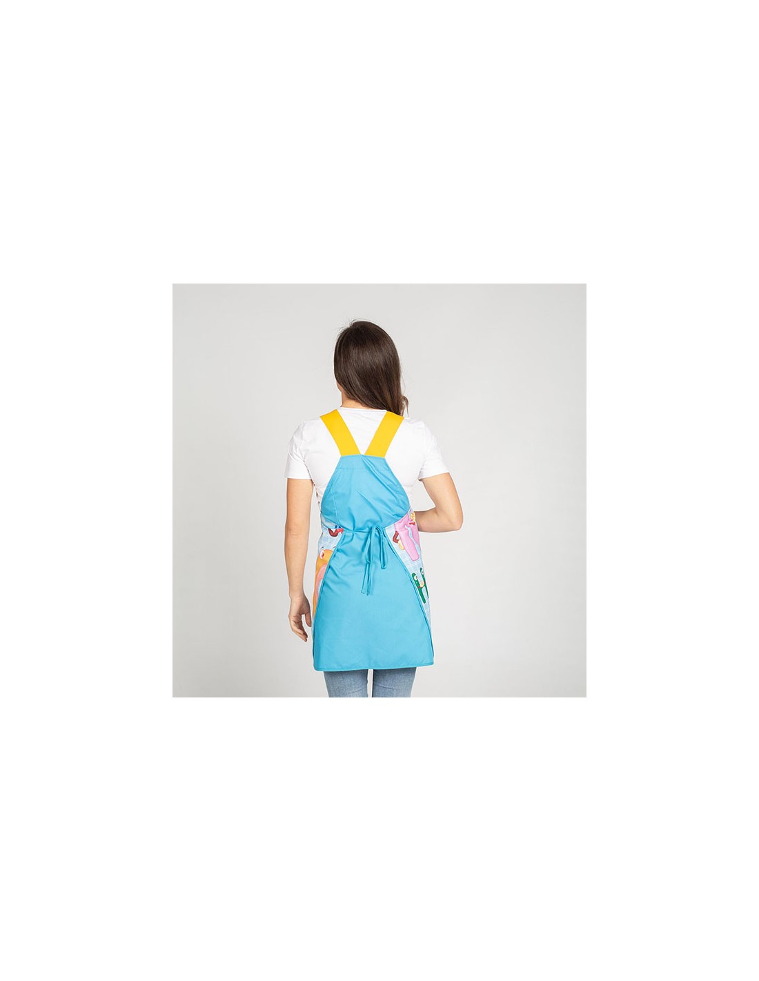Casulla tipo estola, estampada con original y divertido diseño. Cuenta con un bolsillo central, pinzas en la espalda, tirantes y tiras laterales para anudar. Confeccionada en PLANA de 65% Poliéster - 35% Algodón, un tejido muy fresco, fácil de planchar y de secado rápido. Ideal como uniforme colegial para educadoras / maestras en escuelas infantiles y guarderías.