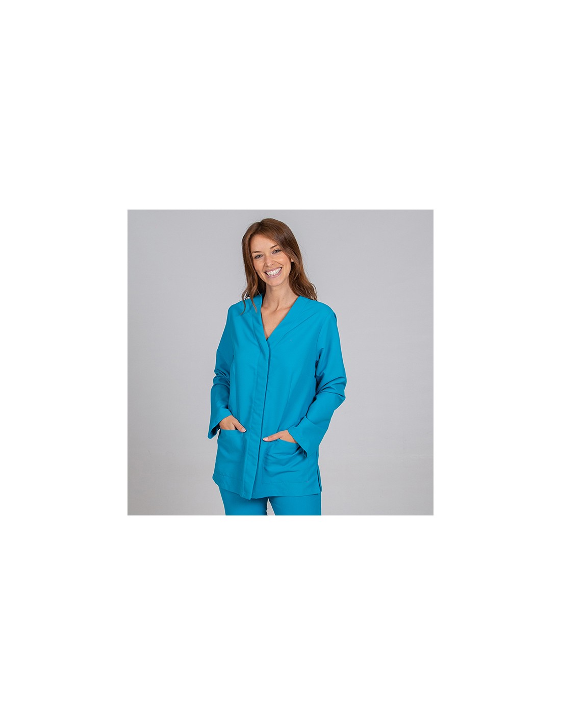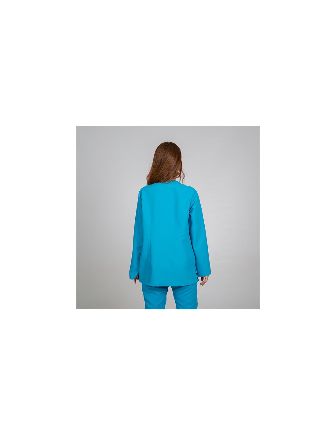 Casaca para mujer en manga larga, con cuello pico, cierre mediante botones de presión ocultos y dos bolsillos de parche delanteros. Prenda semi ajustada, con pinzas en delantero, pecho y espalda. Confeccionada en MICROFIBRA de 100% Poliéster, un tejido antibacterias, altamente transpirable, tolerante a salpicaduras de lejía, lavable a 90º, con un rápido secado, sin necesidad de planchado y repelente al cabello y pelo de mascotas. Ideal para uniformes de enfermería, doctores y demás profesionales sanitarios en hospitales, clínicas y centros médicos, farmacia, laboratorio, veterinario, estética, spa o comercio.