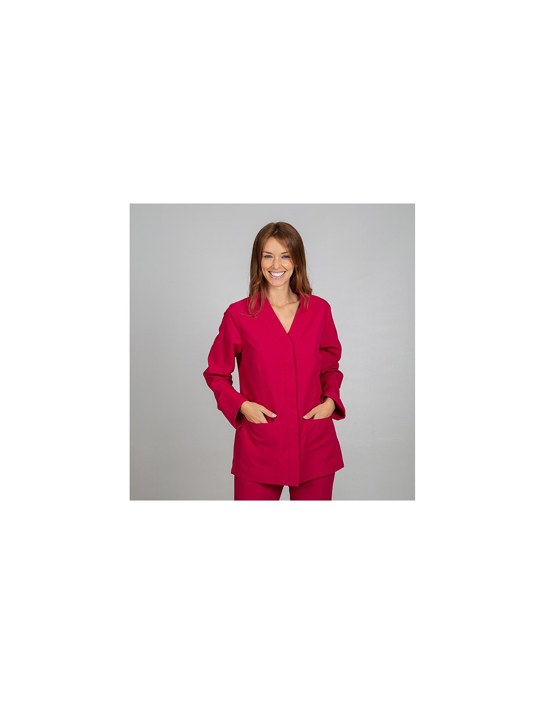 Casaca para mujer en manga larga, con cuello pico, cierre mediante botones de presión ocultos y dos bolsillos de parche delanteros. Prenda semi ajustada, con pinzas en delantero, pecho y espalda. Confeccionada en MICROFIBRA de 100% Poliéster, un tejido antibacterias, altamente transpirable, tolerante a salpicaduras de lejía, lavable a 90º, con un rápido secado, sin necesidad de planchado y repelente al cabello y pelo de mascotas. Ideal para uniformes de enfermería, doctores y demás profesionales sanitarios en hospitales, clínicas y centros médicos, farmacia, laboratorio, veterinario, estética, spa o comercio.